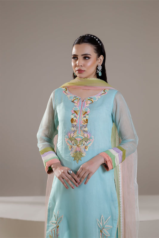 Cyan Pure Organza Hand Embroidered Suit