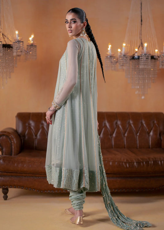 Pistachio Green Embellished Chiffon Gown-Style Suit