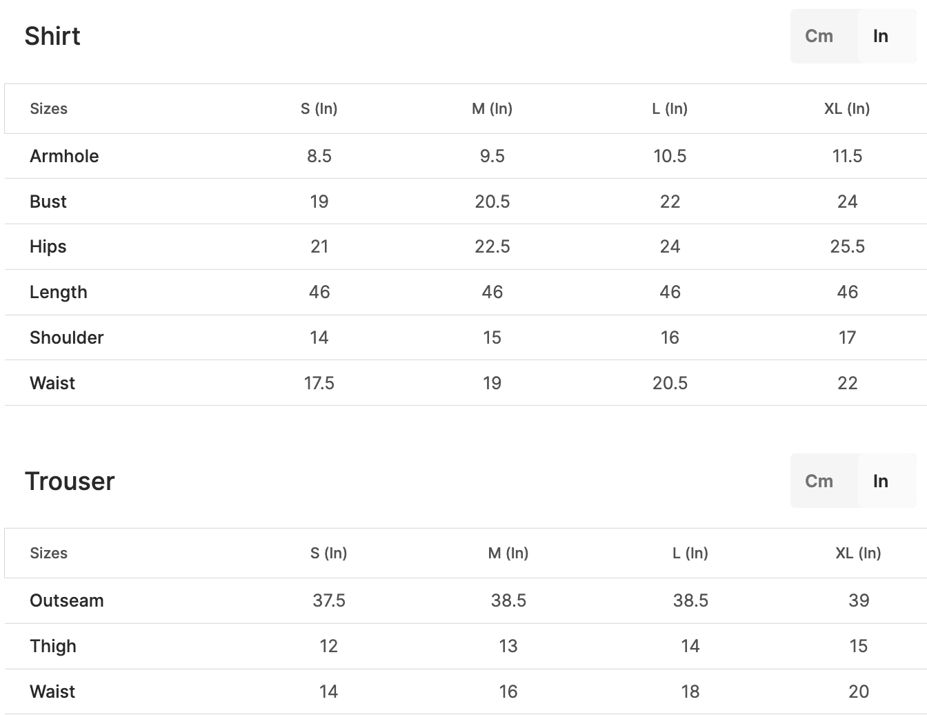 - Measurements are in inches and taken flat (one side only). To get full garment size, double the bust/waist/hip measurements.