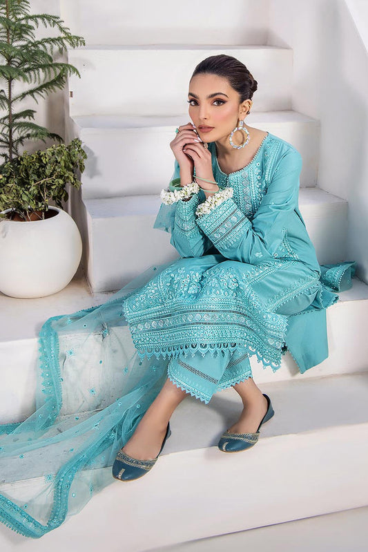 Sky Blue Embroidered Luxury Lawn Suit with Chiffon Dupatta