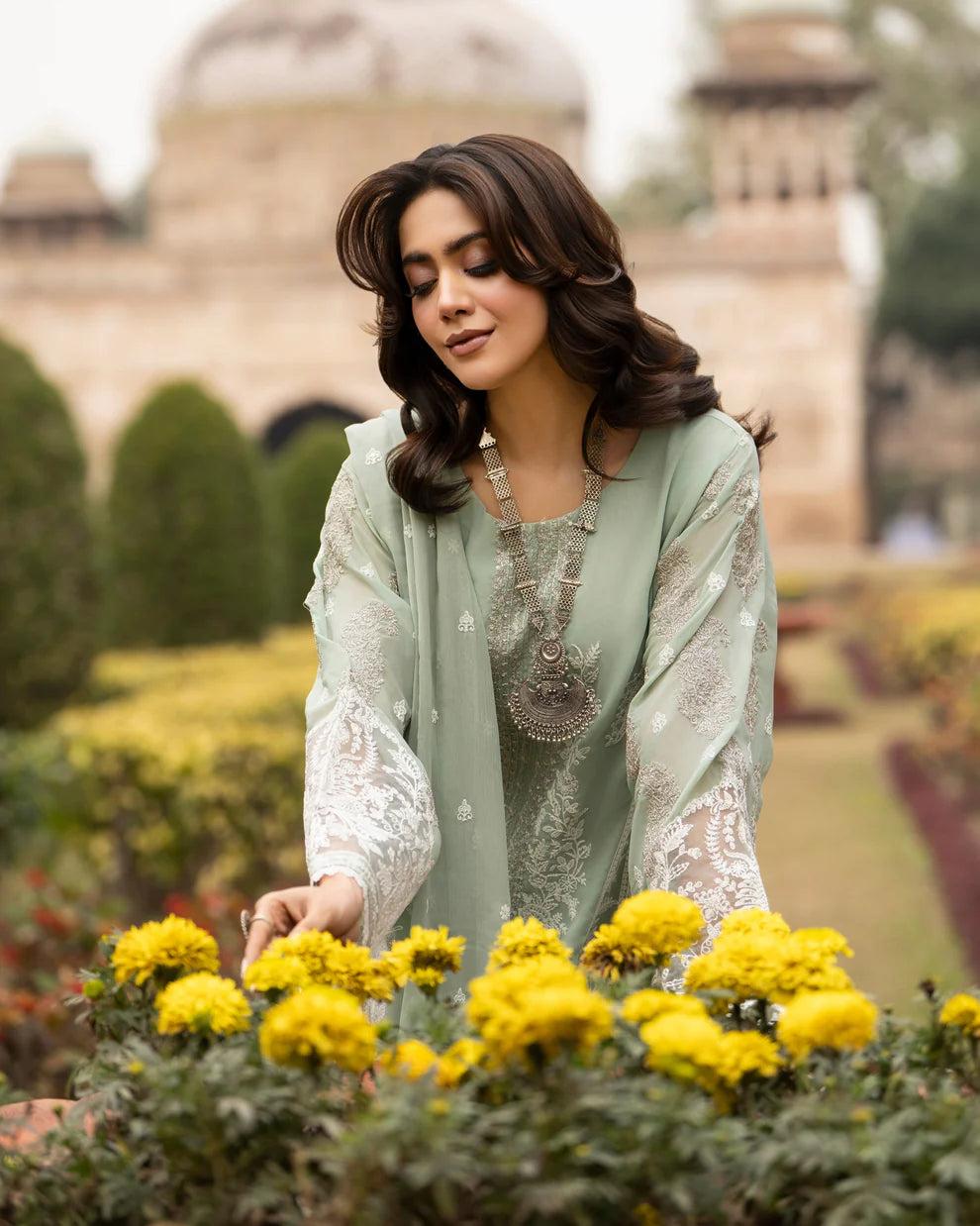• Dupatta: Chiffon dupatta featuring intricate all-around embroidery, adding lightness and an elegant layered dimension.