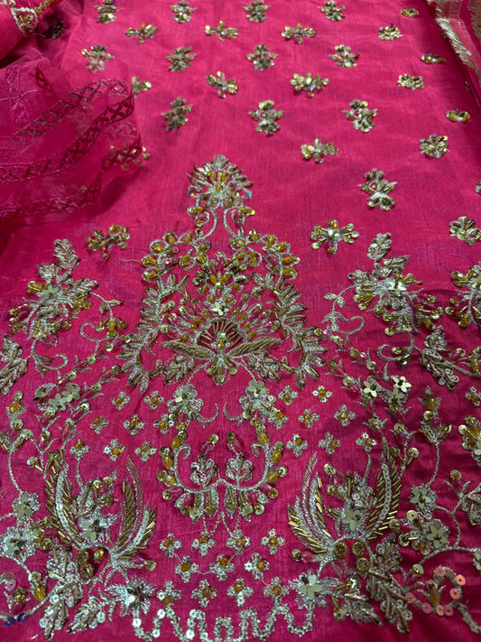 Hot Pink Hand Embellished Raw Silk Suit
