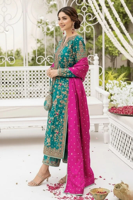 Turquoise Handmade Raw Silk Suit with Shocking Pink Dupatta