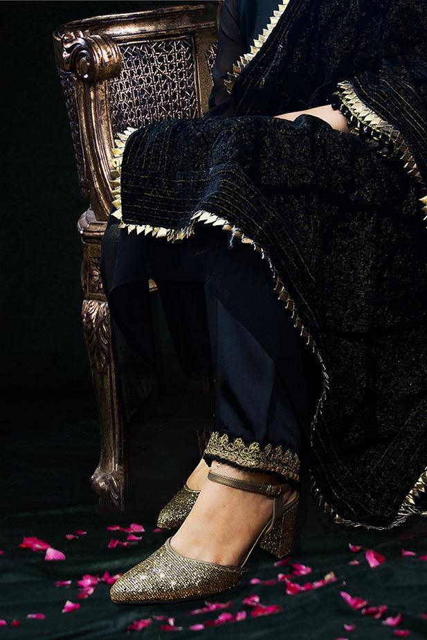Paired with a resplendent Black Micro Velvet Shawl, embellished with delicate Tilla embroidery and bordered with Gotta, this ensemble epitomizes sophistication, making it the perfect choice for grand celebrations and special occasions.
