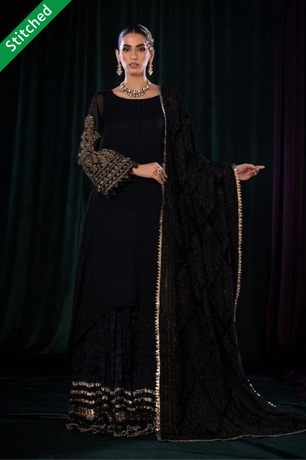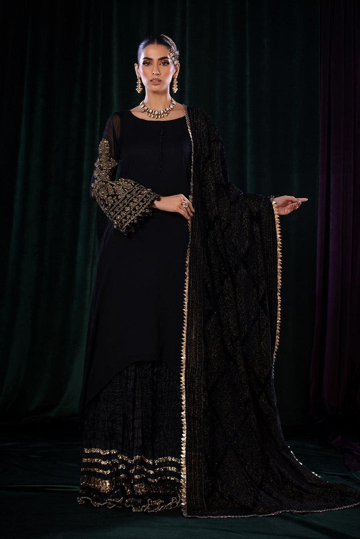 Choose your bottoms: embrace the glamour of a Crushed Crinkle Chiffon Sharara or opt for the graceful Chermeouse Silk Shalwar, each offering a distinct touch to complement your style.