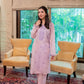 A light lilac-coloured ready-to-wear ensemble has a shirt and trousers. It has lavender embroidery on the neckline, sleeves and front panel as well.