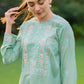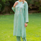 Ready-to-wear minty green, 2-piece suit with intricate embroidered details on shirt front and sleeves, paired with matching straight trousers.