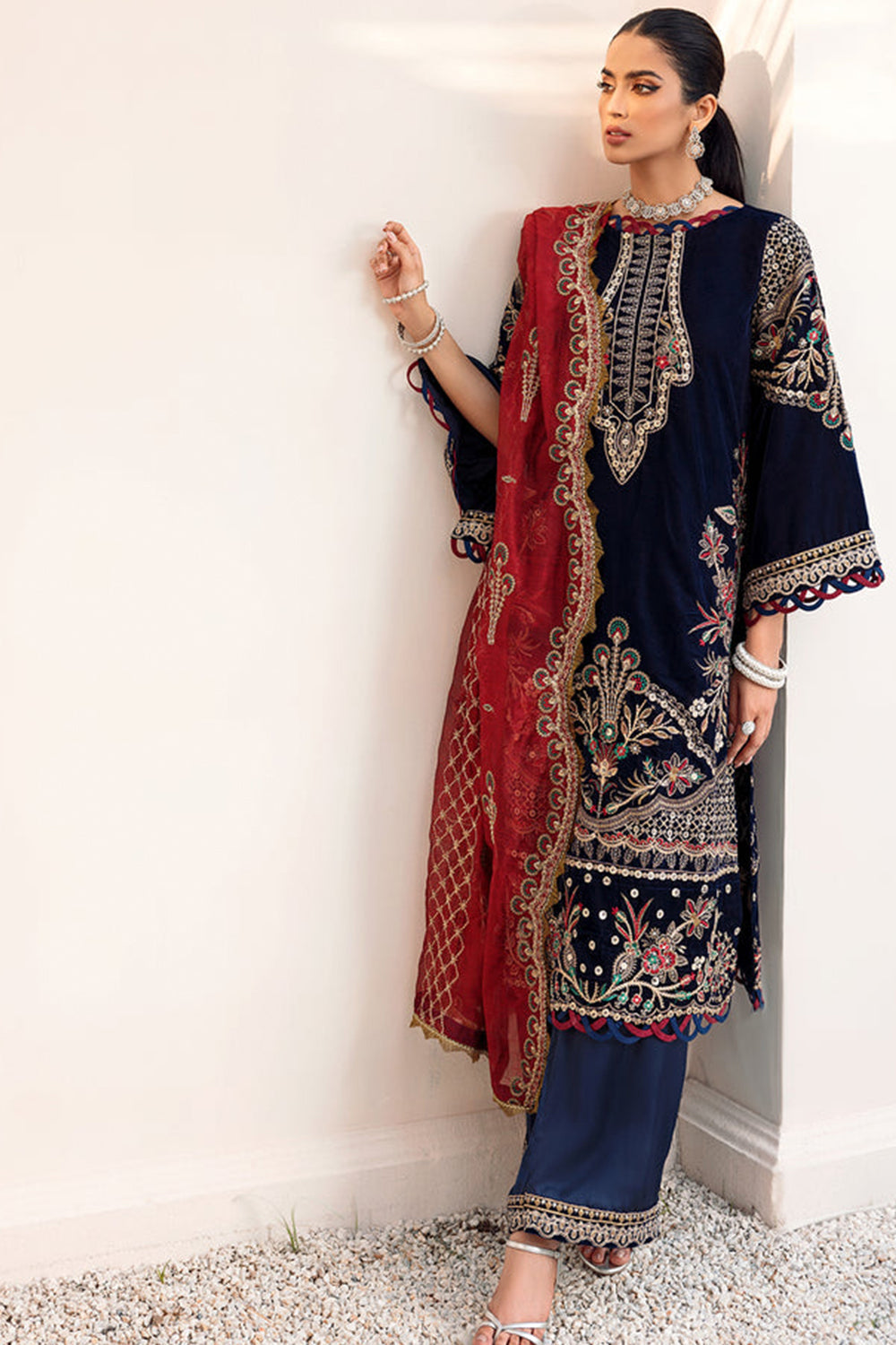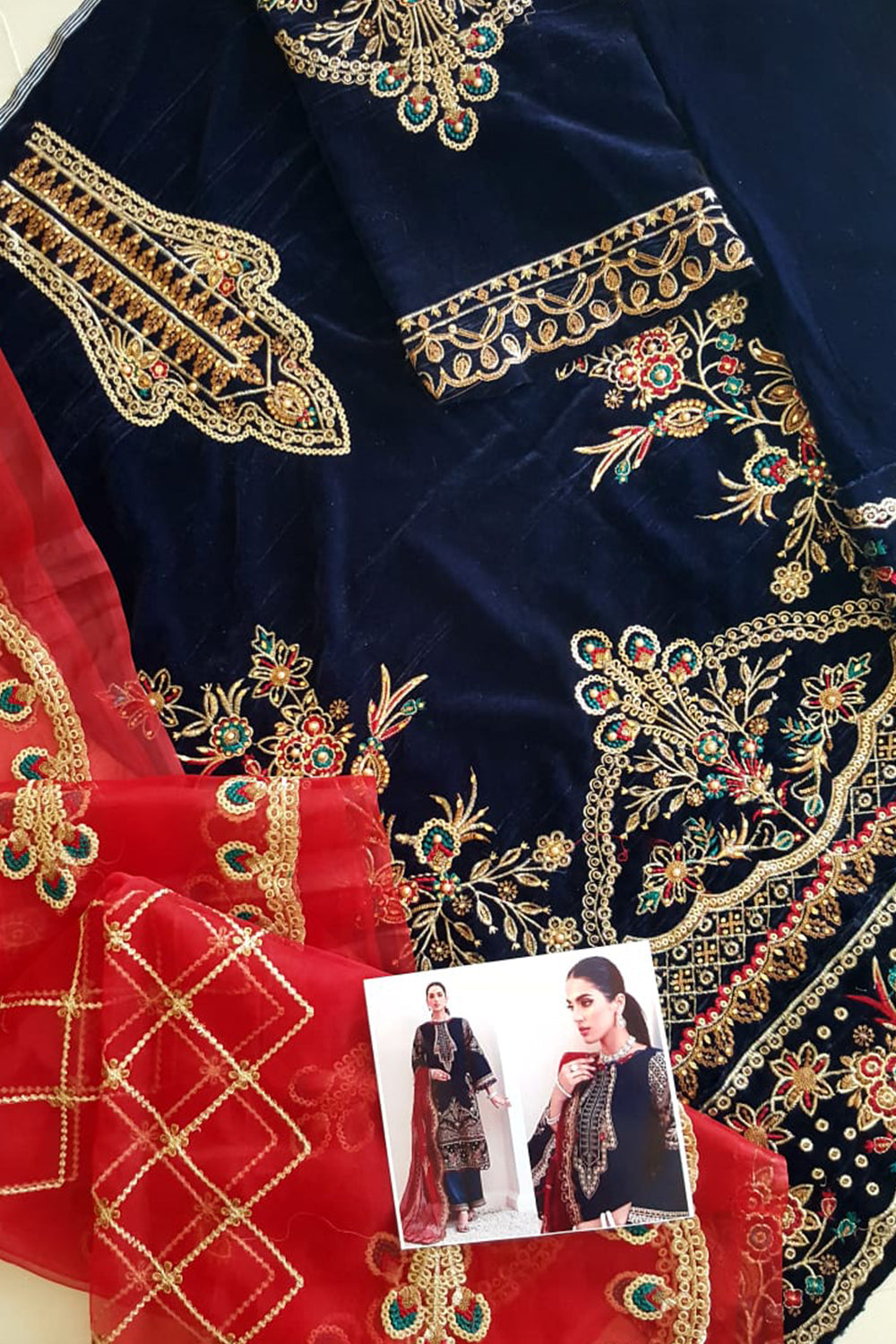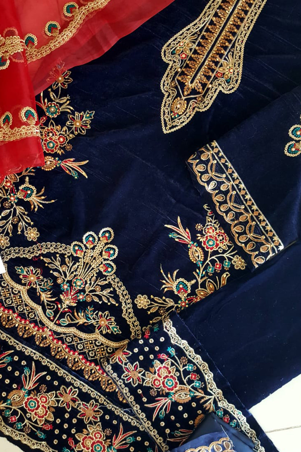 Hand Embroidered Velvet + Pure Raw Silk Chunnari Suit Size 44
