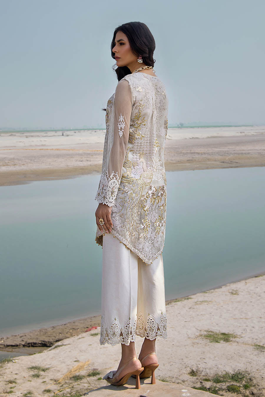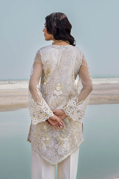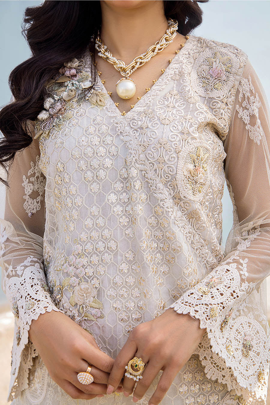 • Shirt: Intricate 3D hand embroidery on organza fabric, featuring floral motifs with sequins, resham threads, beadwork, and fabric petals. The design combines delicate detailing with a luxurious finish