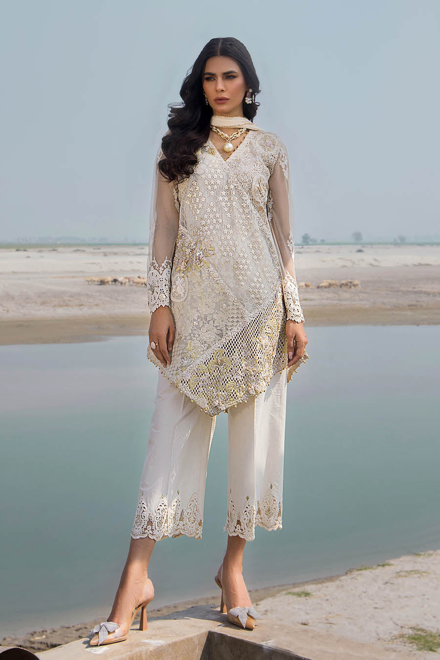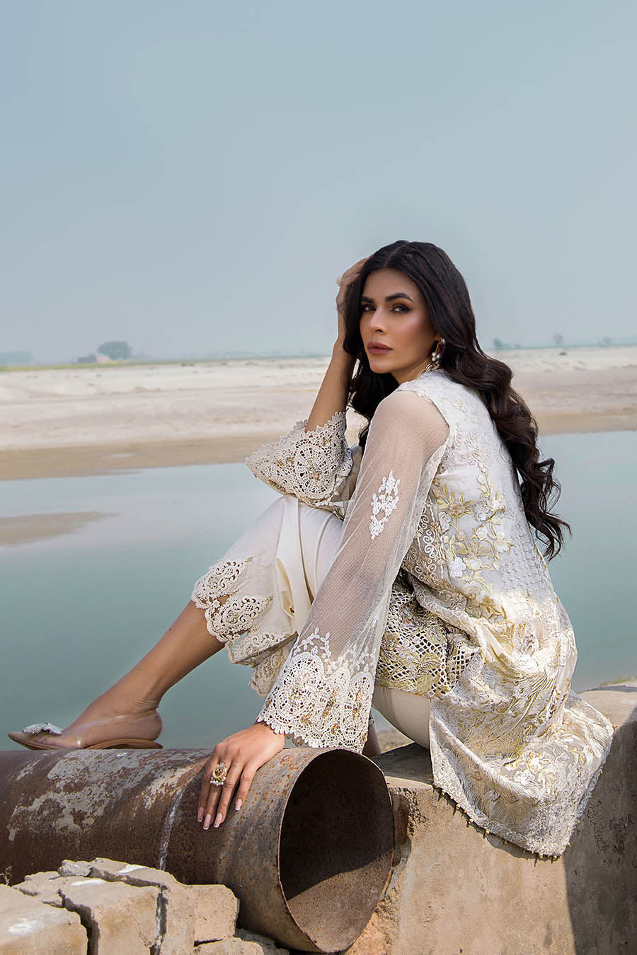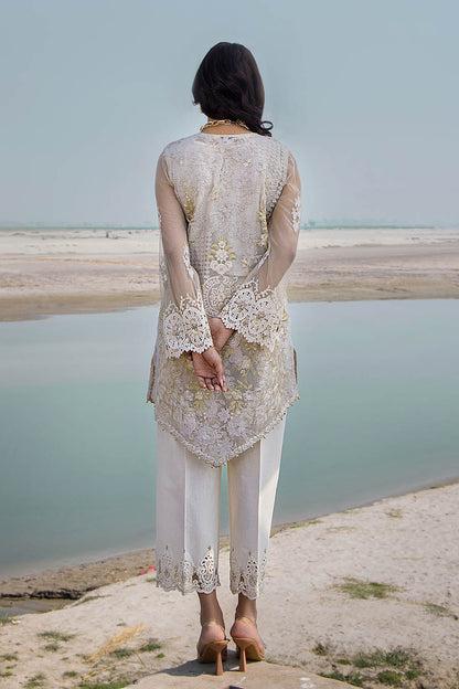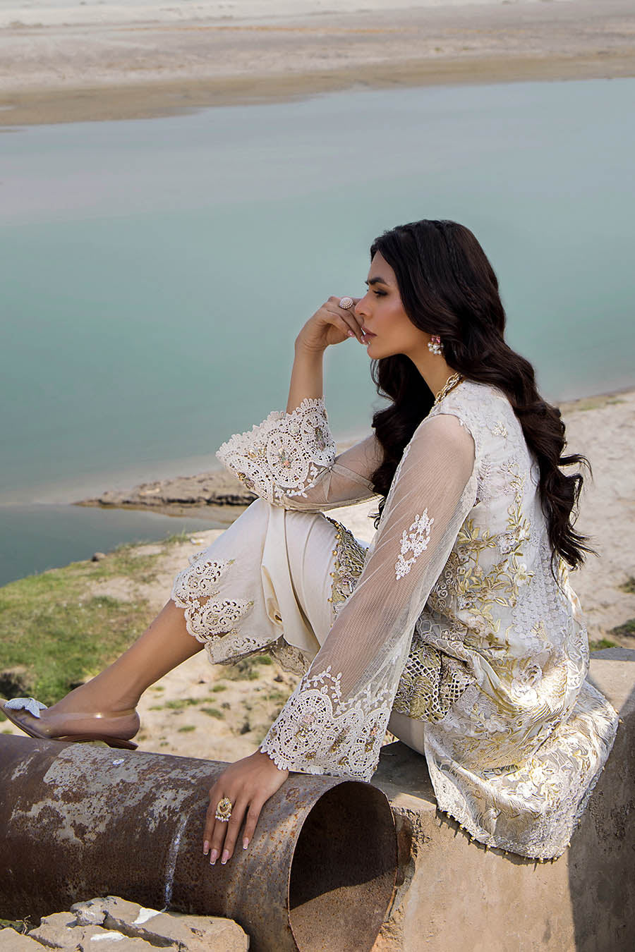 • Shirt: Intricate 3D hand embroidery on organza fabric, featuring floral motifs with sequins, resham threads, beadwork, and fabric petals. The design combines delicate detailing with a luxurious finish