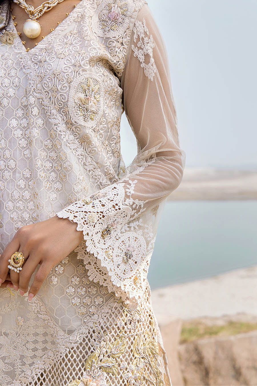 • Sleeves: crochet-style lace with hand embellishments including sequins, resham thread, floral and crystal accents
