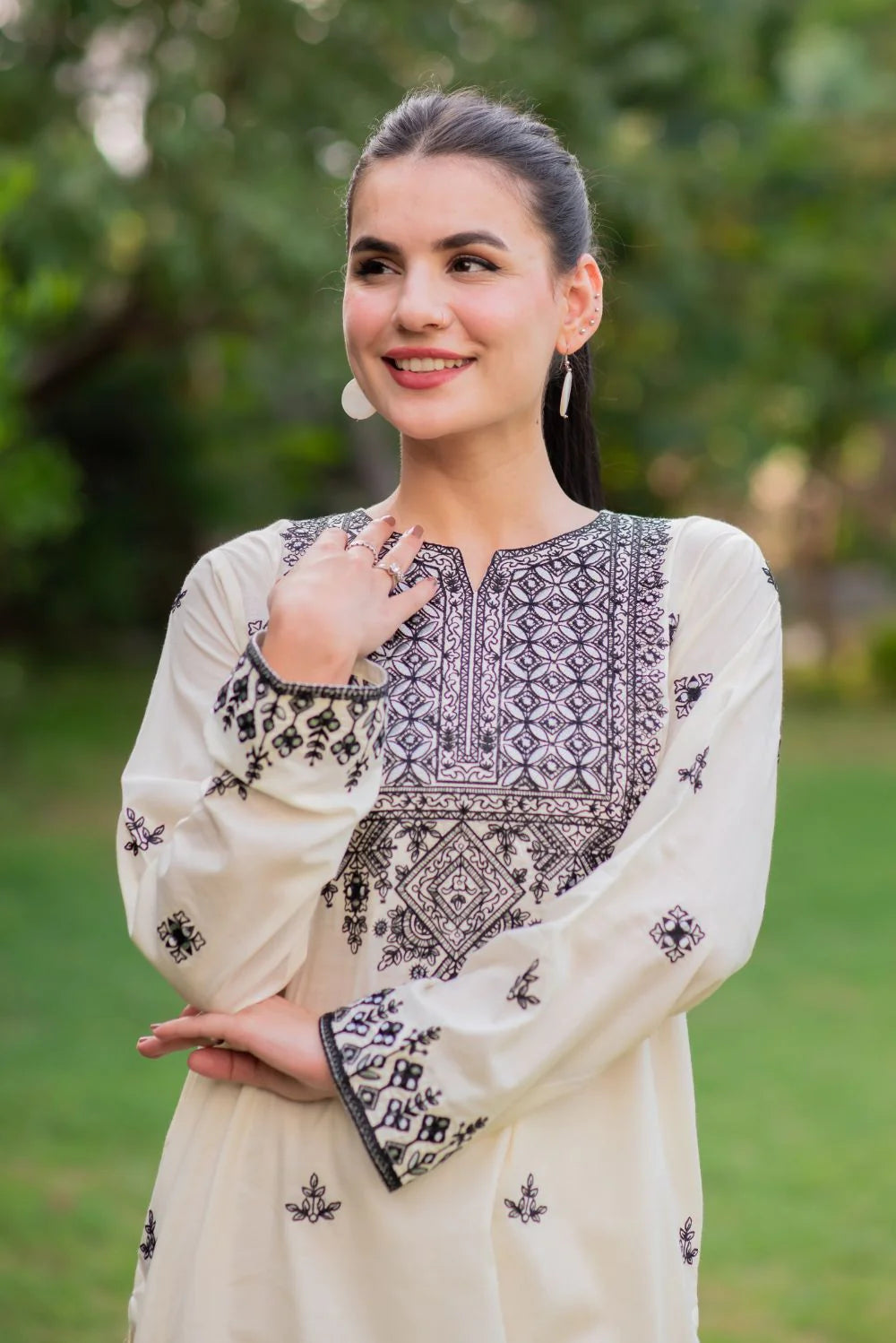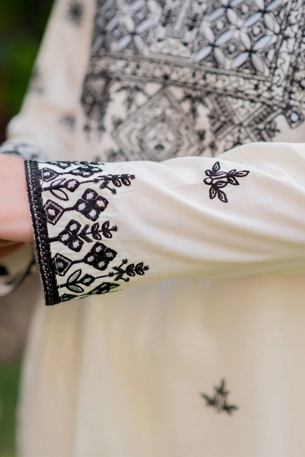 The classic combination of pearl-white ready-to-wear two-piece suit with black embroidery all over the shirt front and sleeves, paired with matching straight trousers.