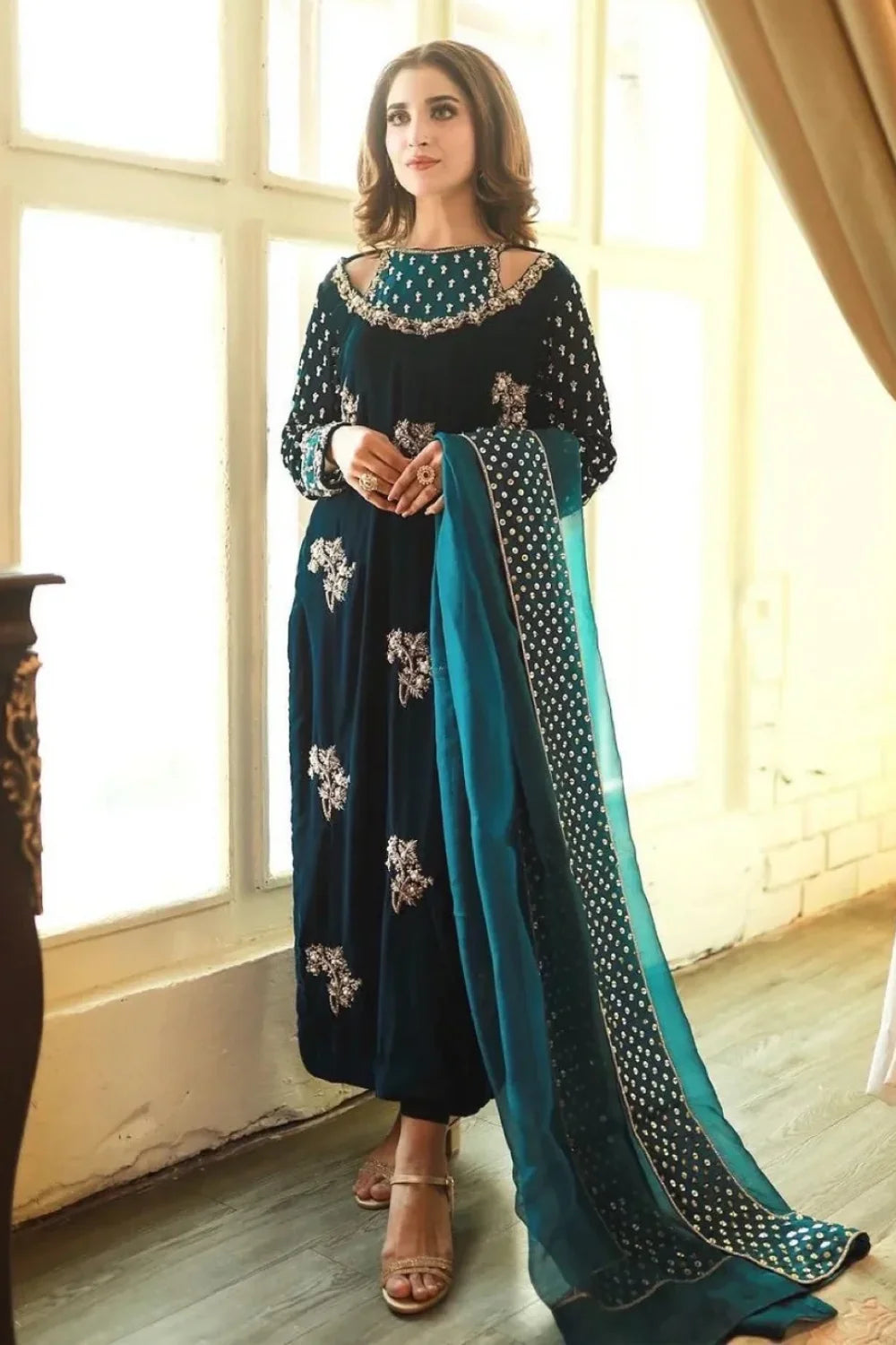 Velvet Embroidered Hand Embellished Sleeves.