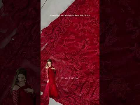 Exquisite hand embroidery etched on a canvas of bright red fabric. The unique cut of the blouse and embellishments on the pallus are all you need to stand apart in a wedding festive. Perfect saree for any festive event .