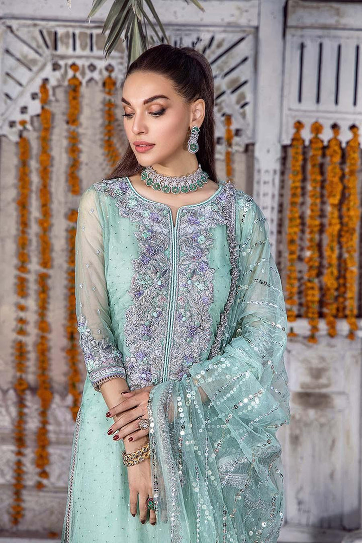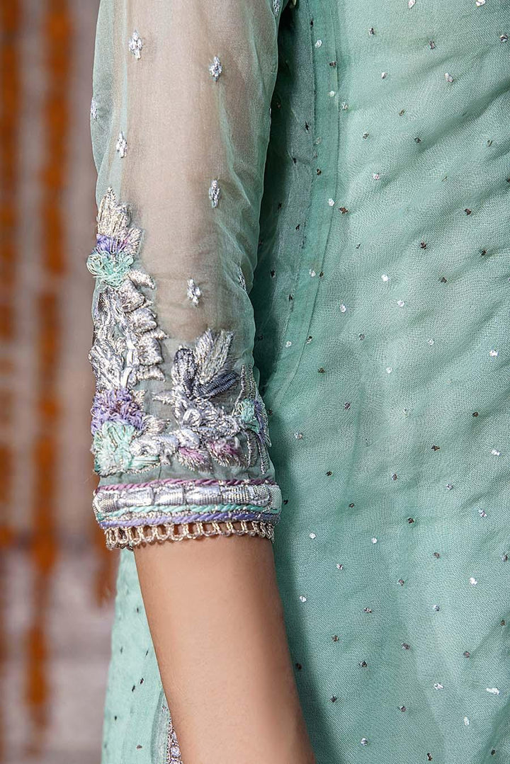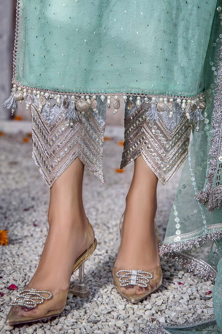 The Pure Organza Mukesh-sprayed shirt, kissed by moonbeams, boasts hand-embroidered Kora Dabka, 3D motifs, and sequins. Its ethereal companion, the Net Dupatta, glimmers with embellishments, Gotta work, and sequins. And for the finale, choose your path: either the classic Pure Banarsi Trousers or the flowing Crushed Banarsi Sharara.
