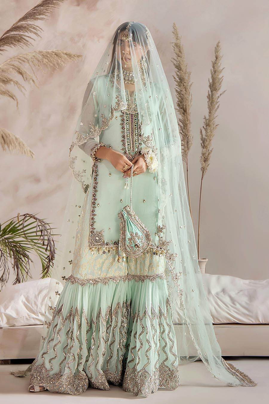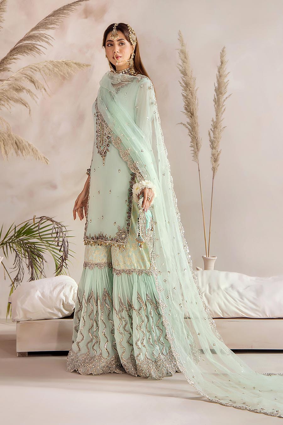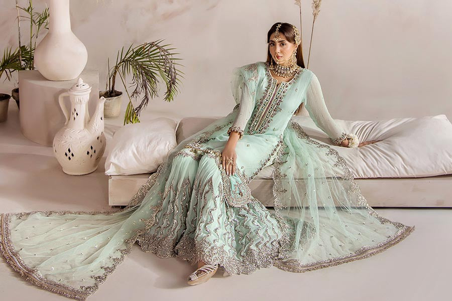 Hand Embroidered Turquoise Pure Chiffon Gharara