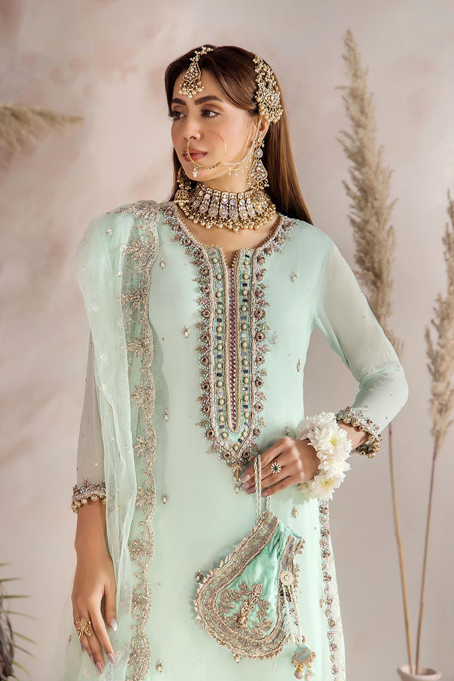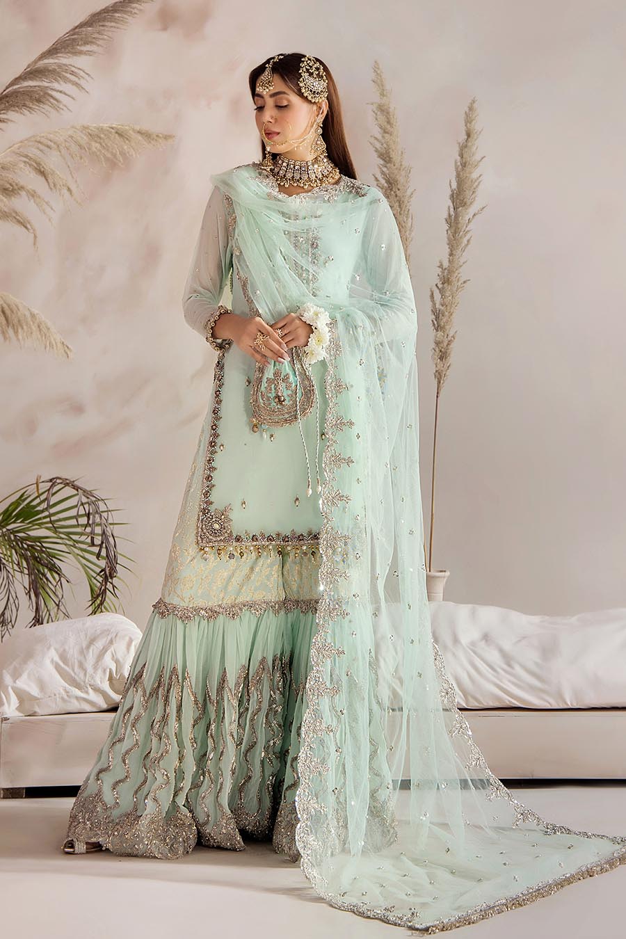 • Shirt: Crinkle Chiffon (Hand Embroidered with Kora, Dabka, Stones and Gotta)