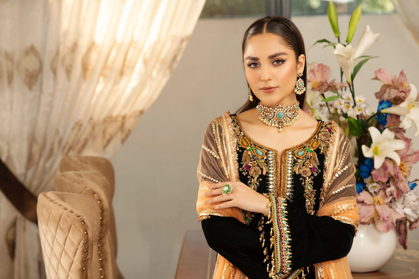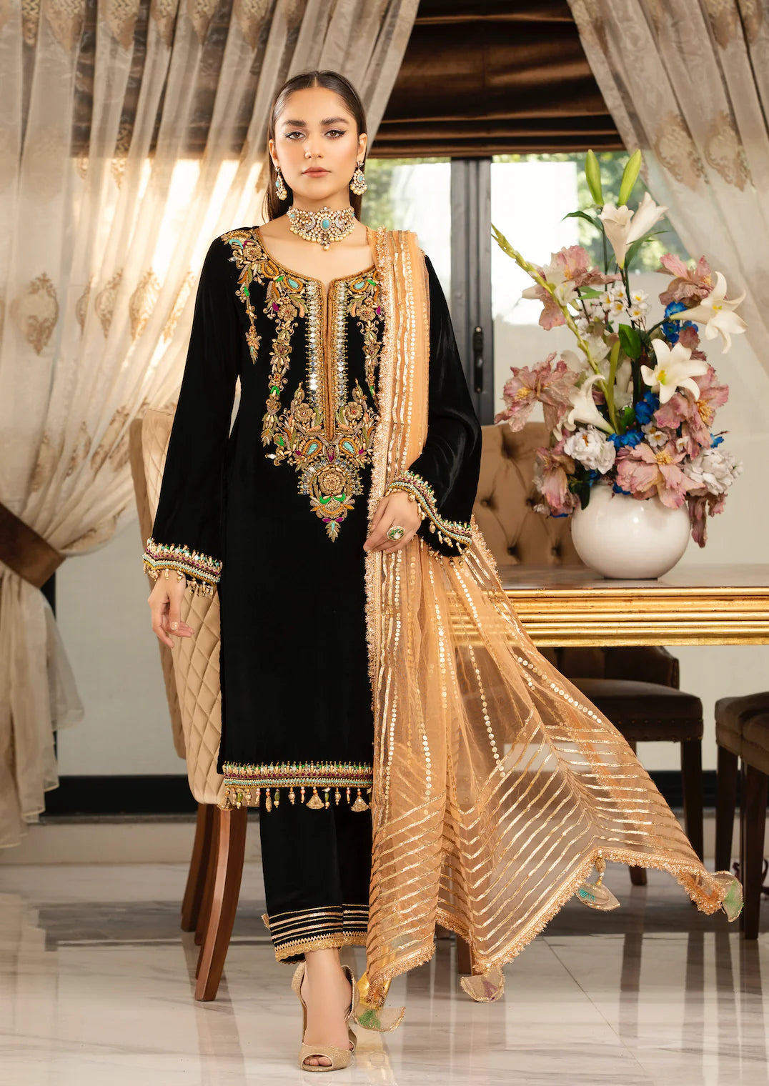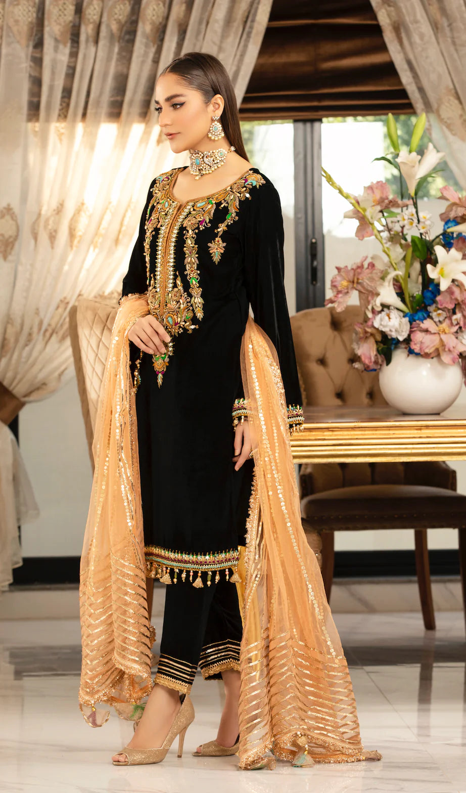 • Sleeves: Micro Velvet (Hand Embroidered with Kora, Dabka & Embellishments)