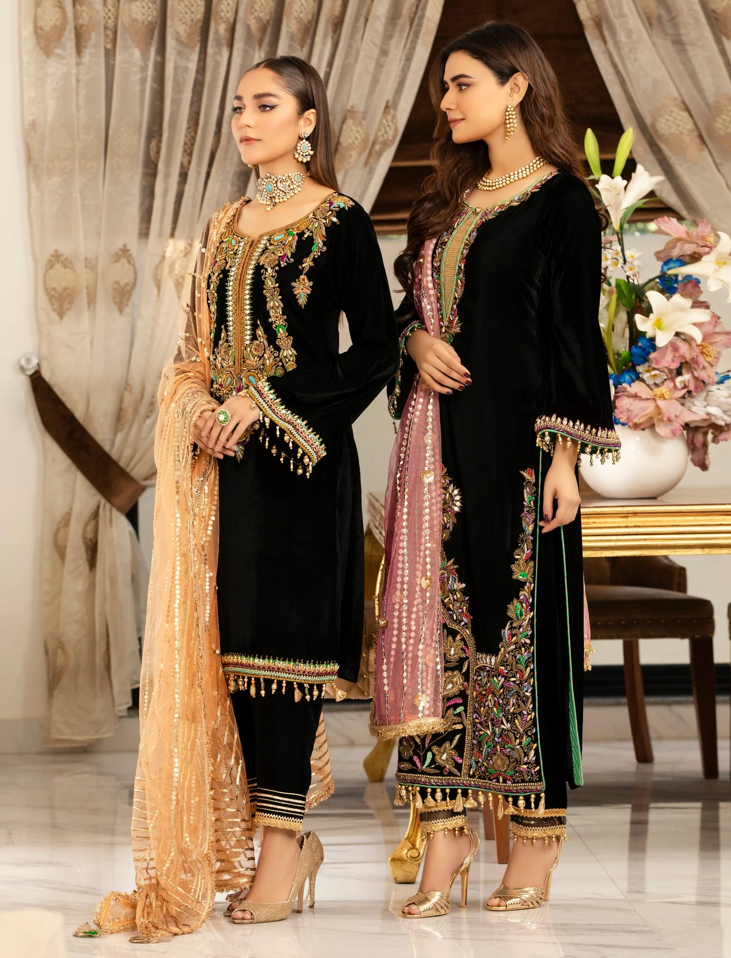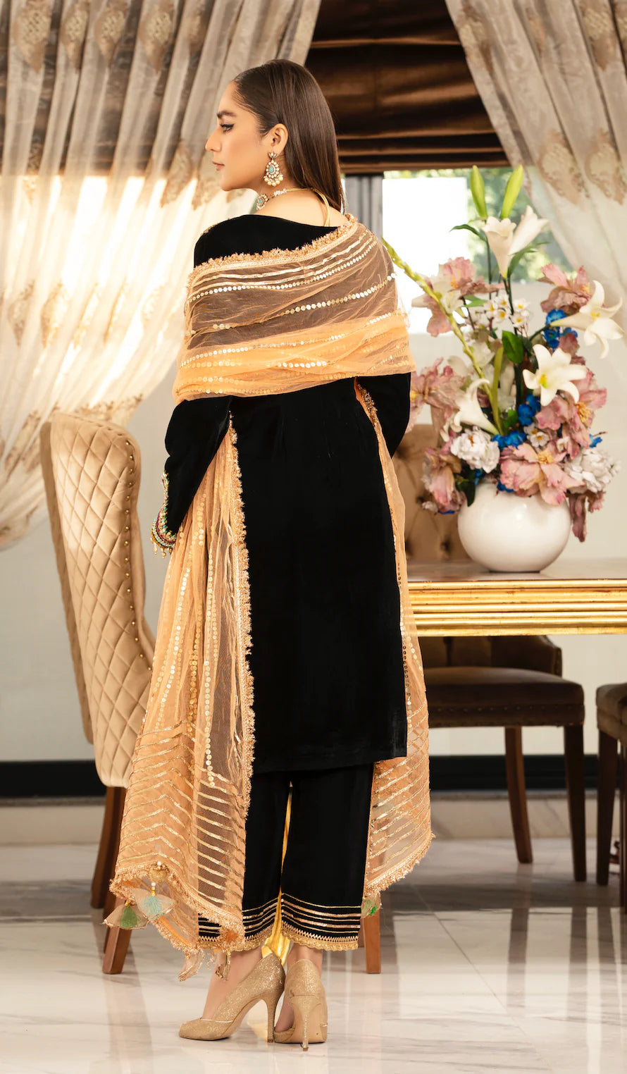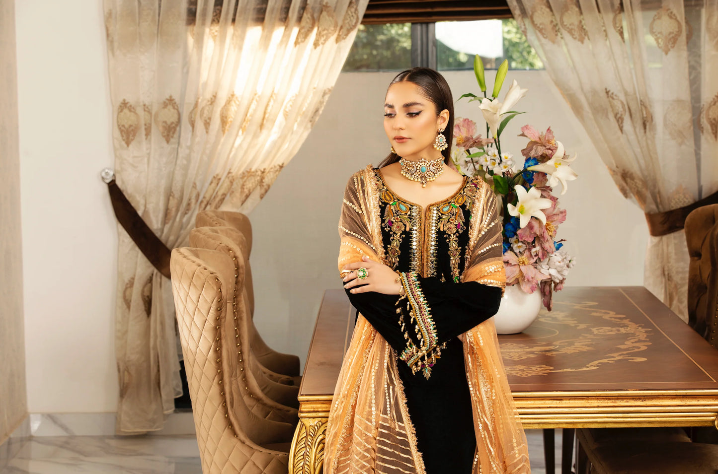 • Sleeves: Micro Velvet (Hand Embroidered with Kora, Dabka & Embellishments)