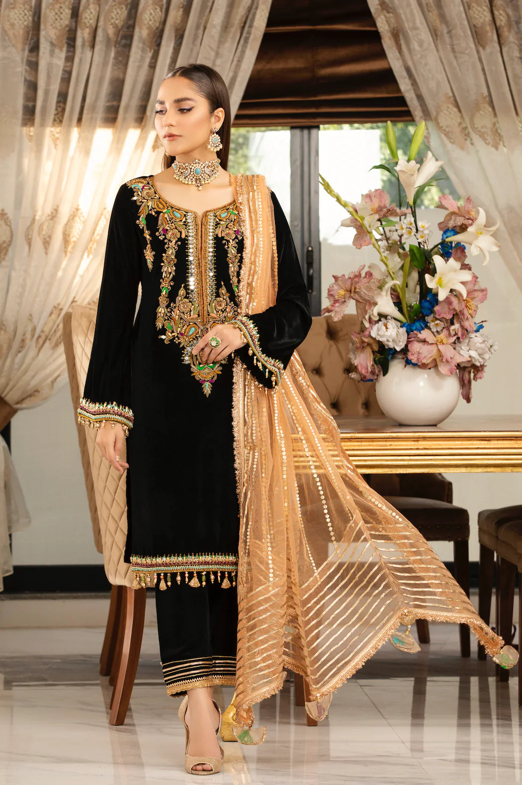 • Shirt: Micro Velvet (Hand Embroidered with Kora, Dabka, Embellishments & Pearls).