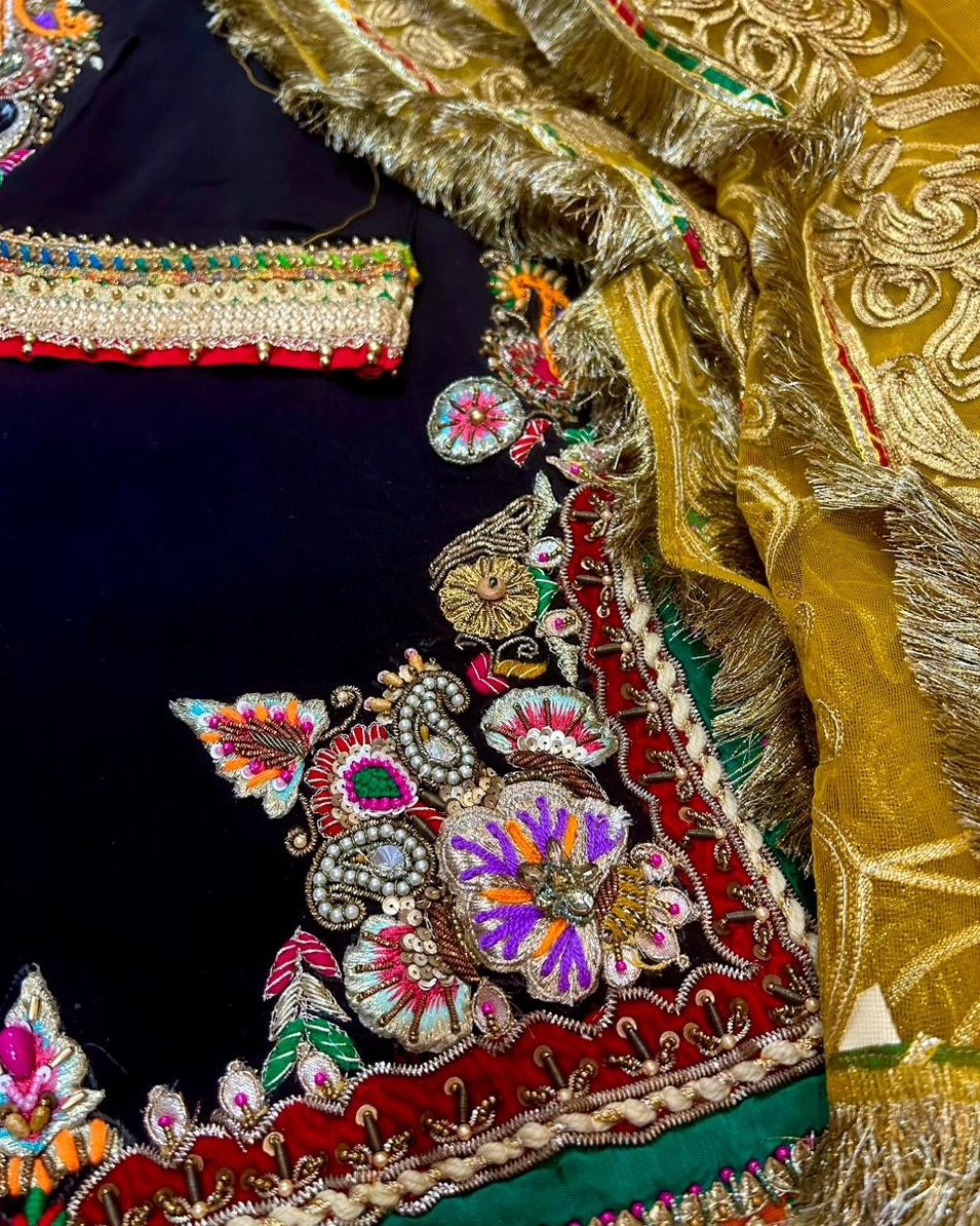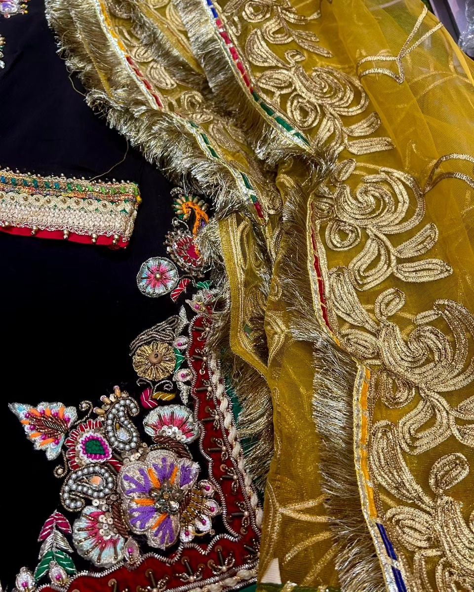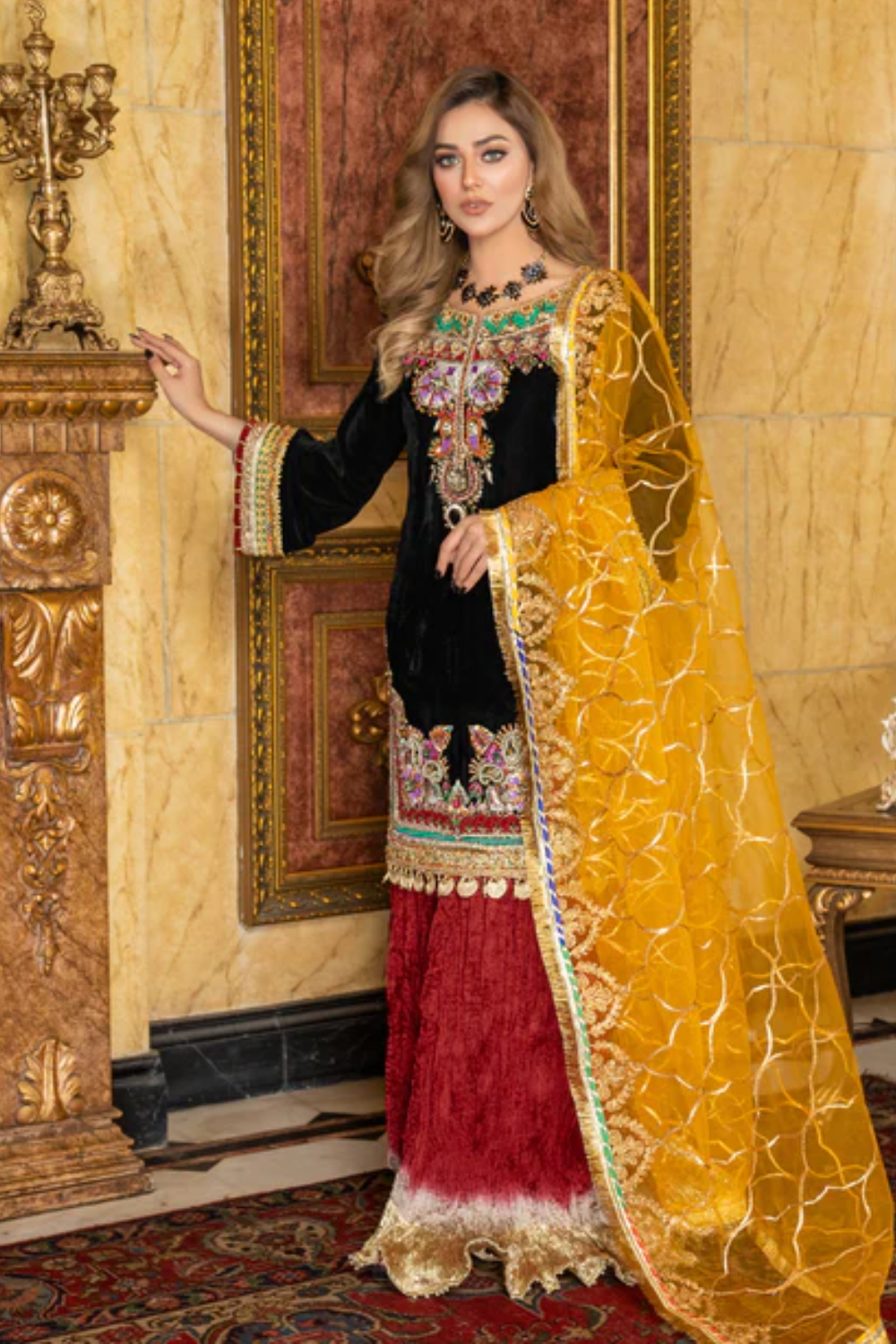 Hand Embroidered Velvet + Pure Raw Silk Chunnari Suit Size 44