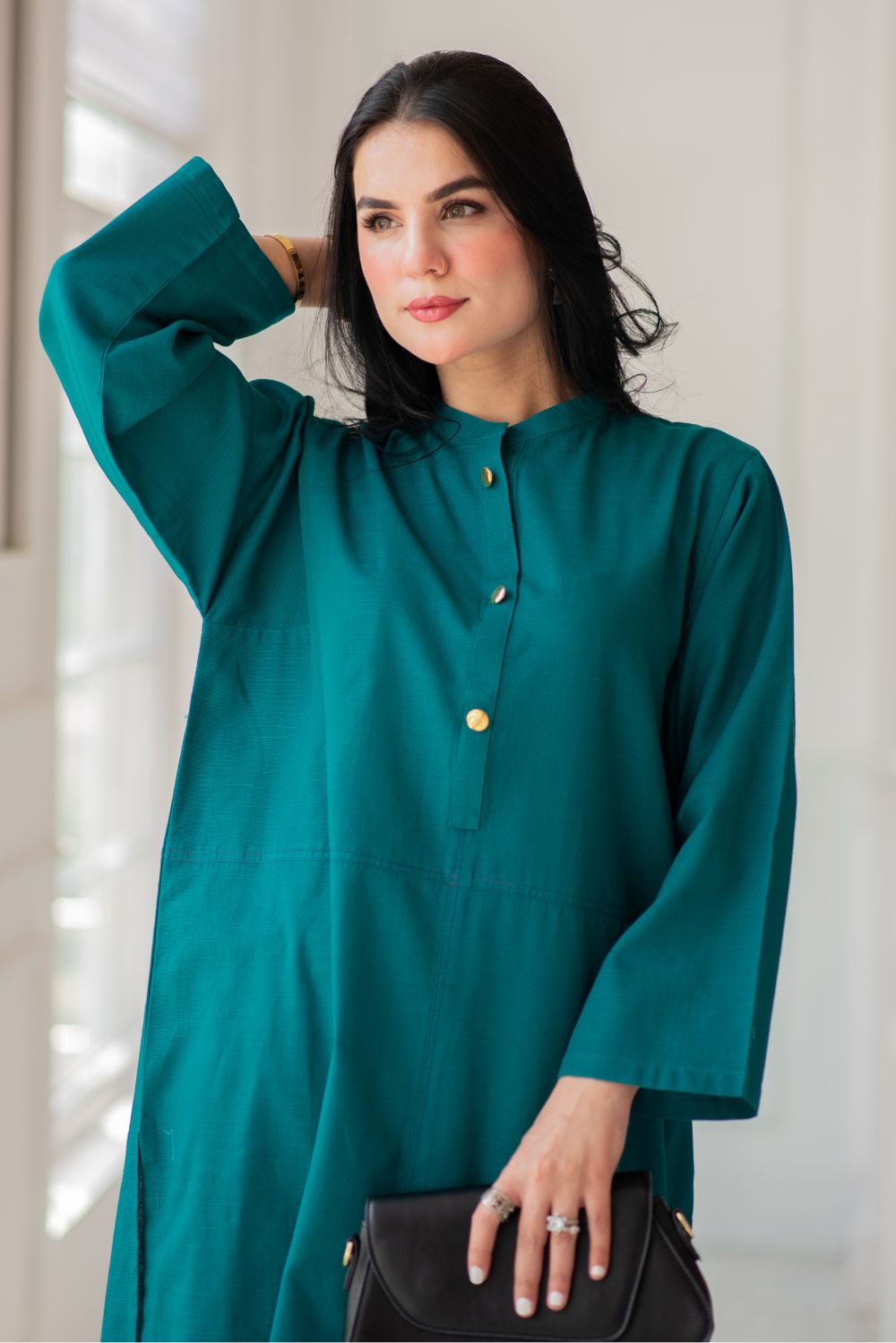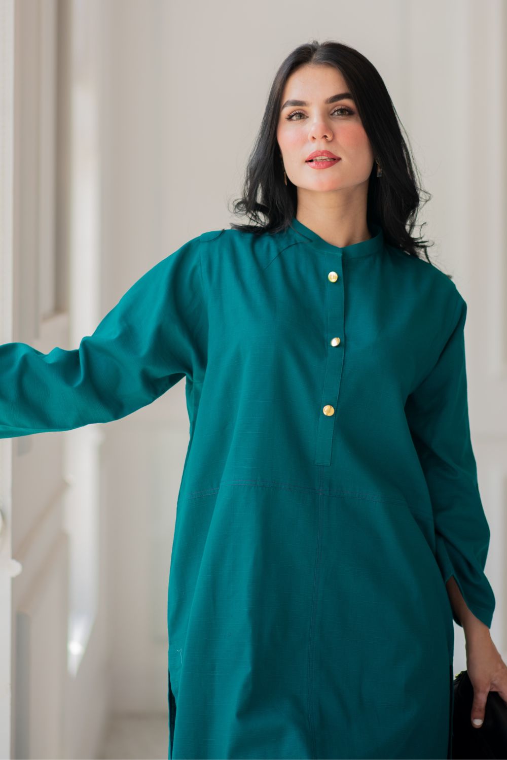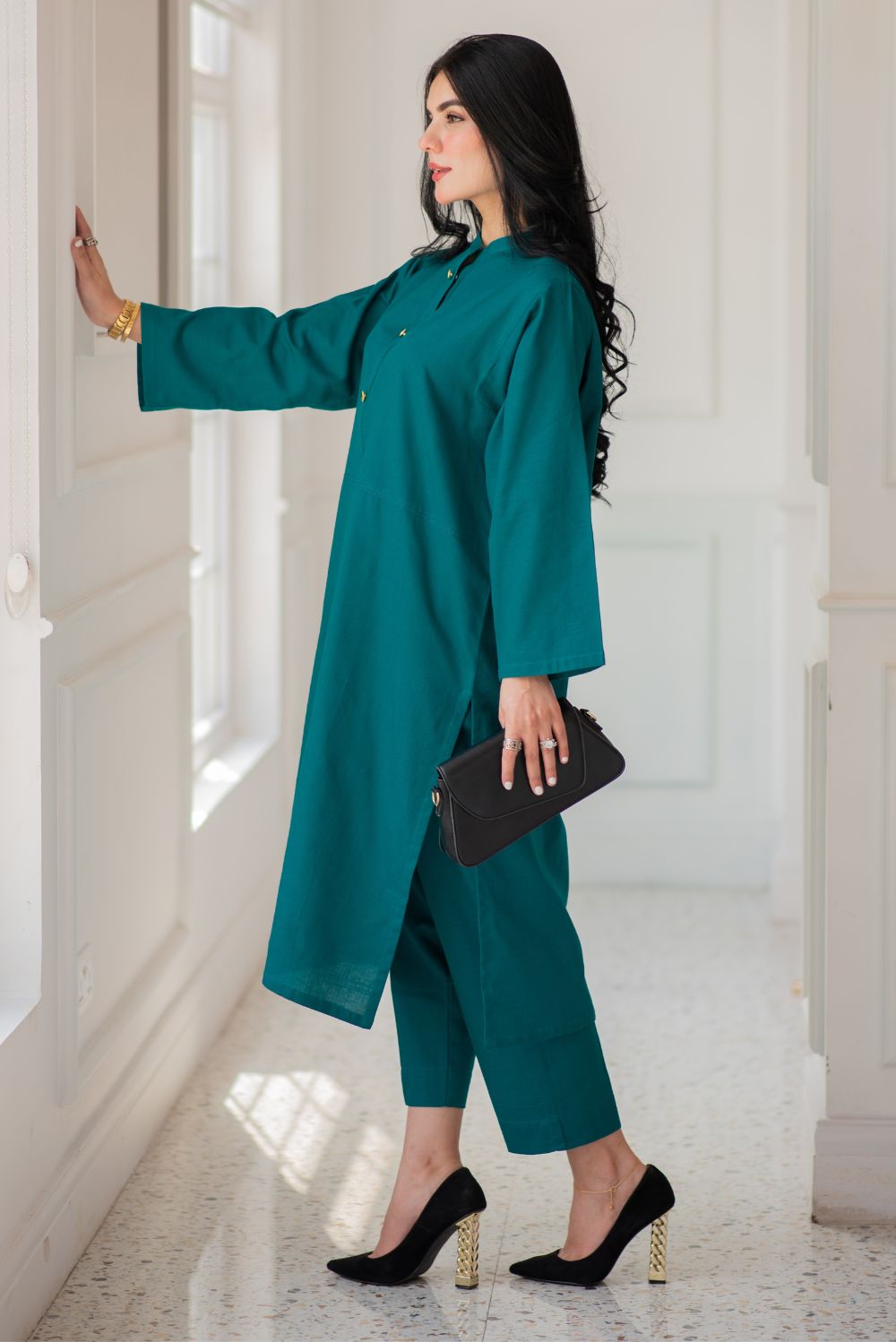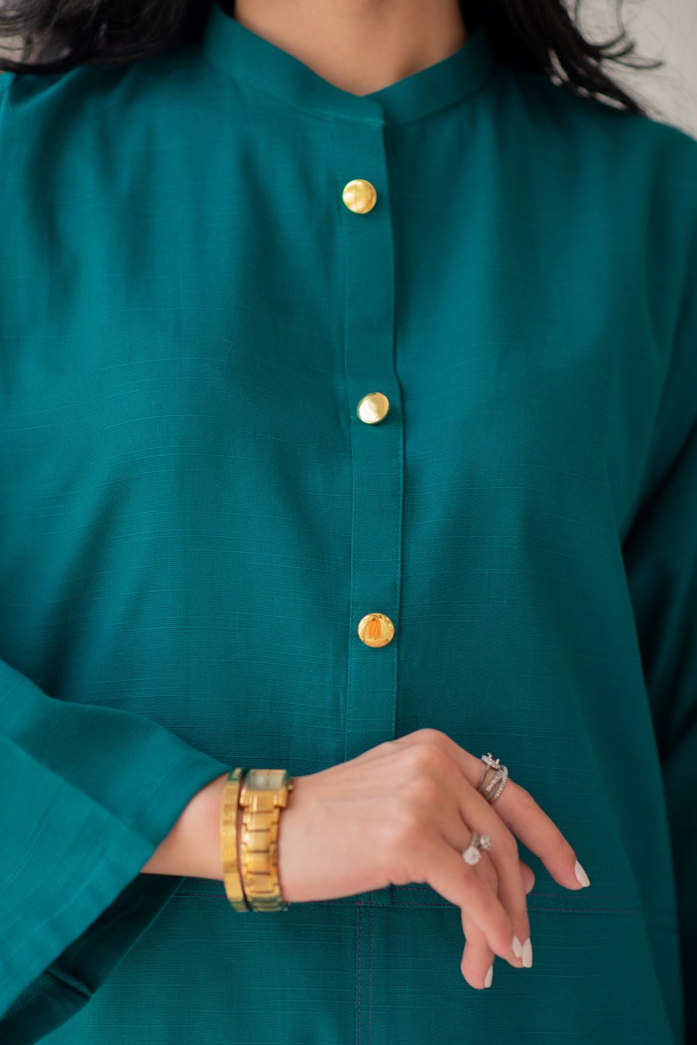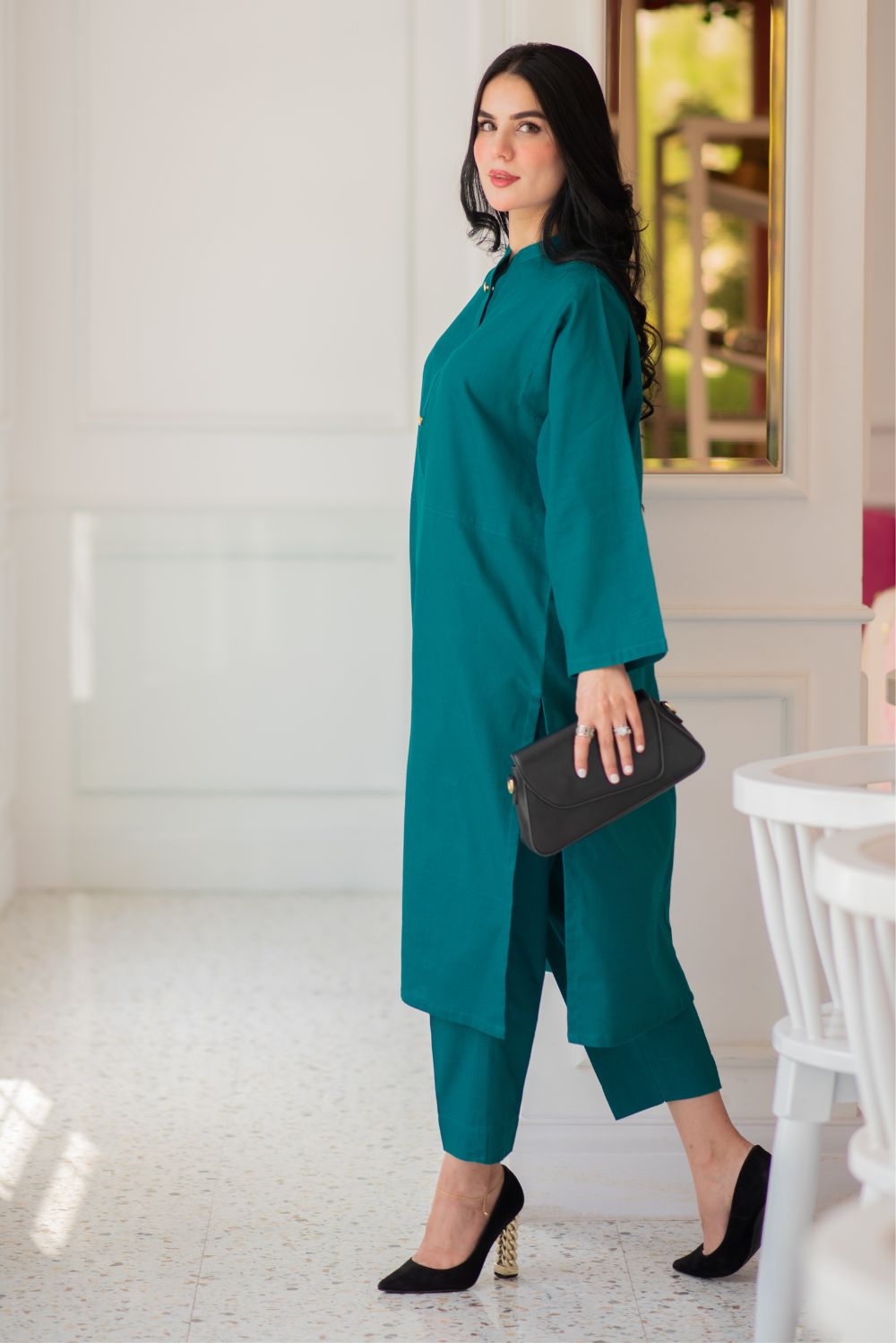 Radiate confidence with our solid teal matching separates set - a bold and contemporary ensemble featuring a full-length shirt with a button-down neckline, paired with straight trousers.