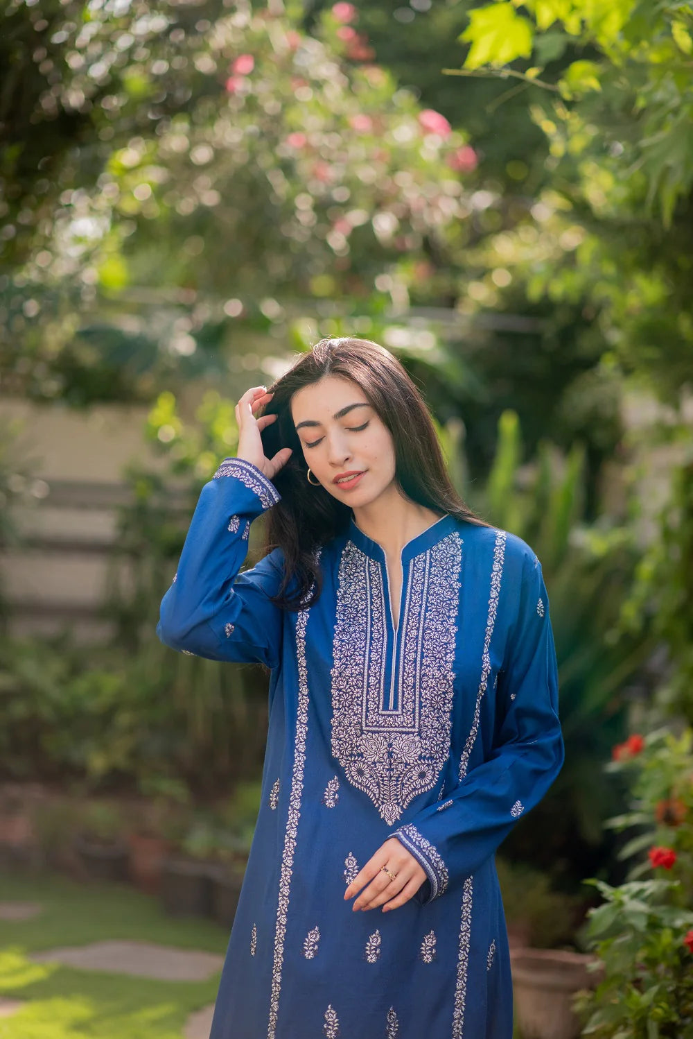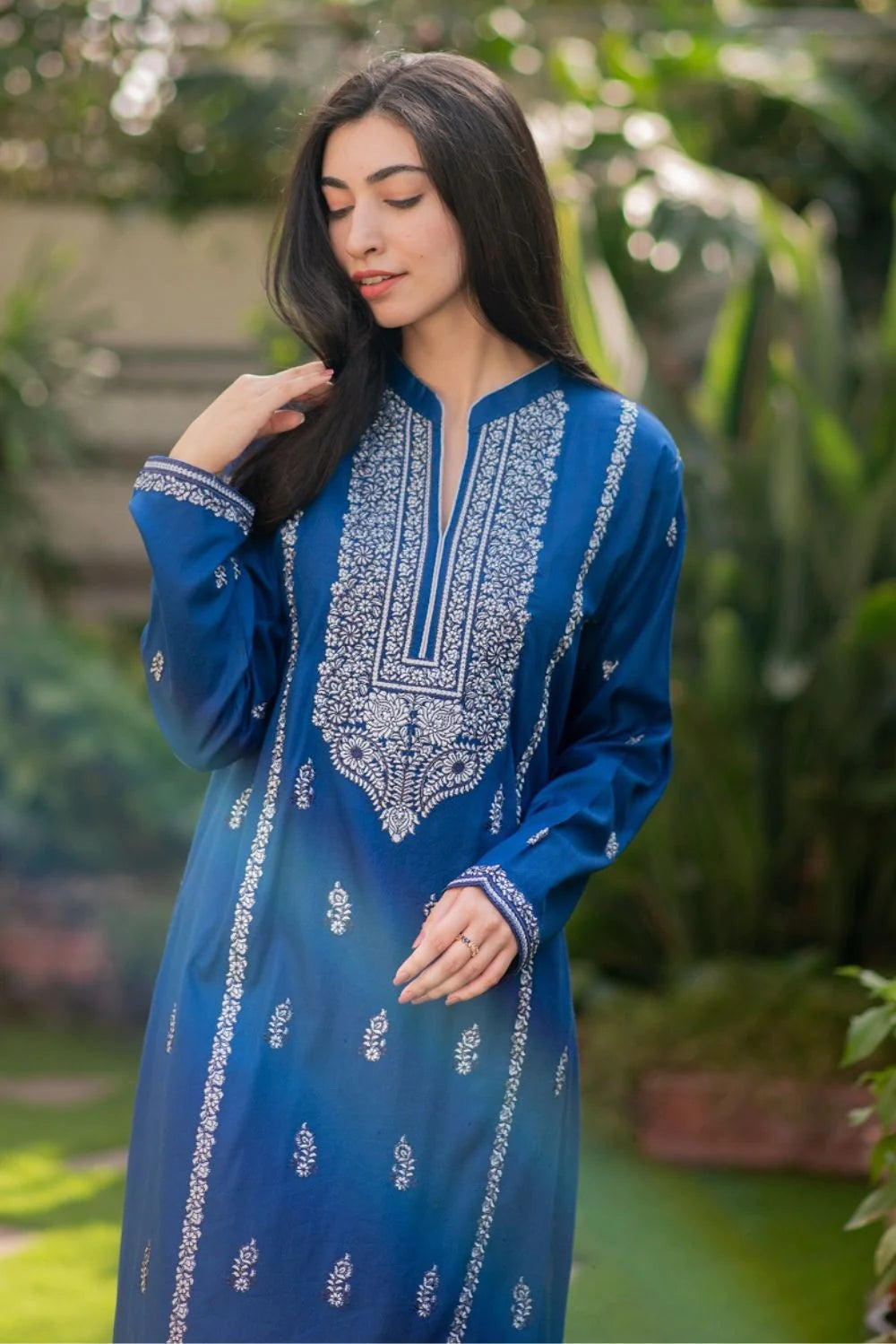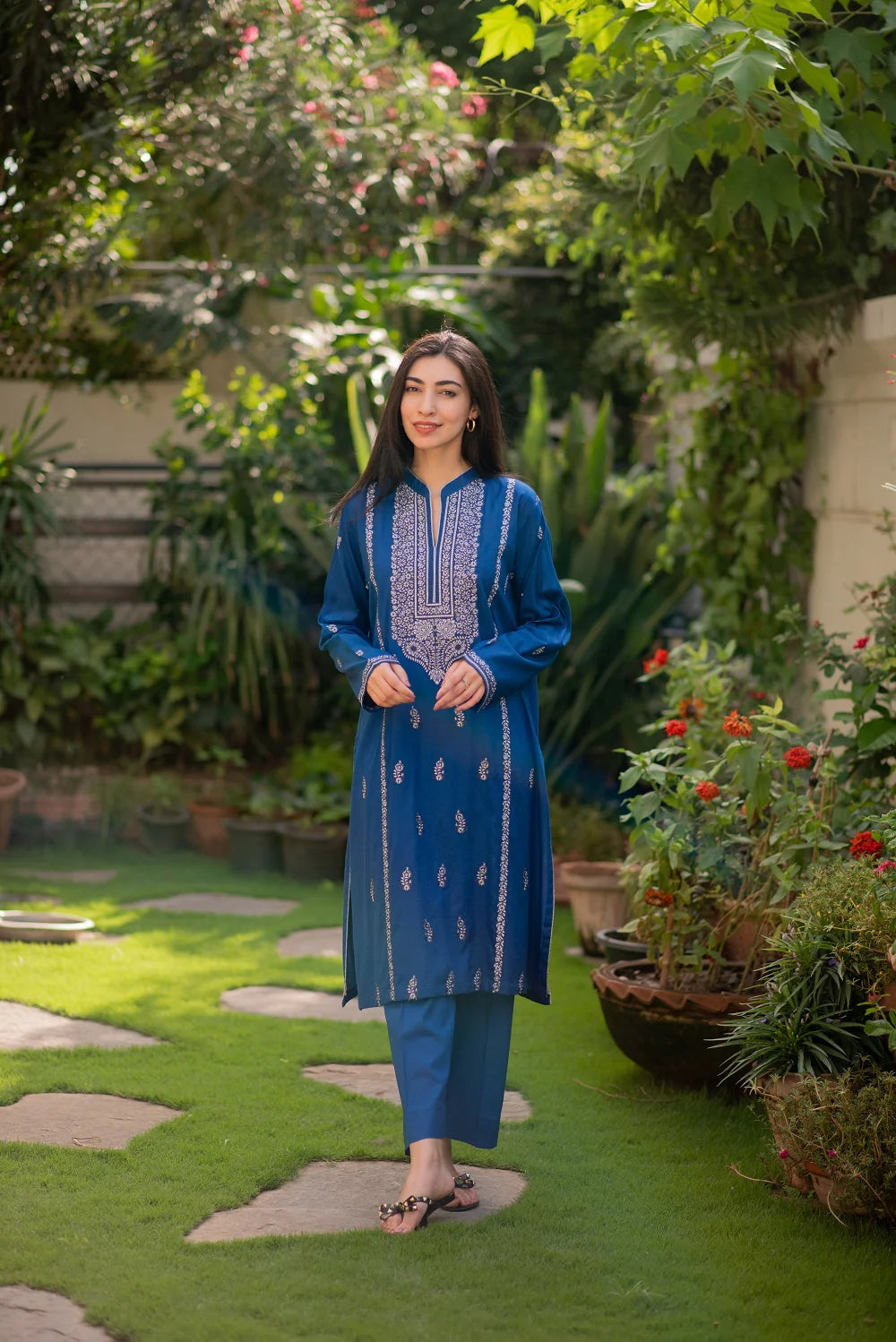 An Egyptian blue ready-to-wear ensemble in a lawn shirt and summer cotton trousers with silver and black classic embroidery on the neckline, sleeves and front panel.