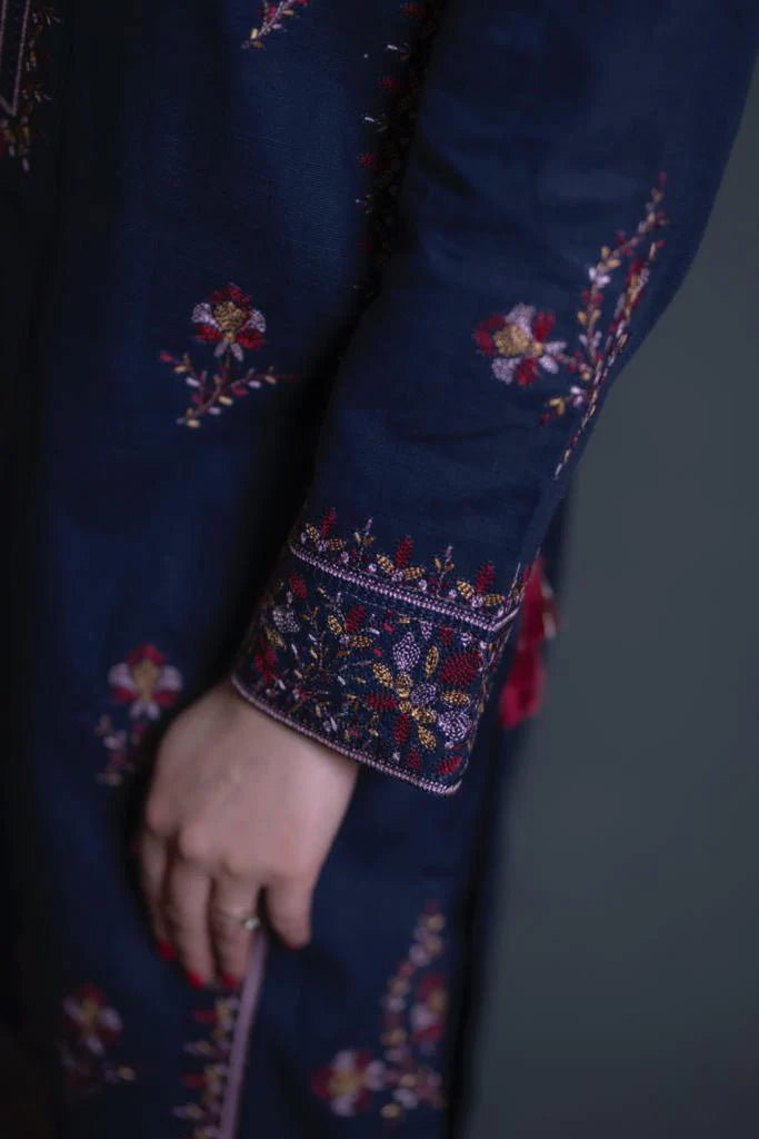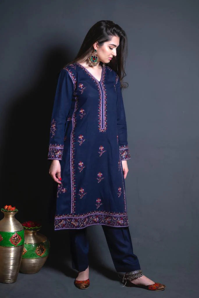 “Pulwama” is a navy blue, stitched two-piece with multicolour intricate embroidery. Wear it on lunch or girls' days out, and stand out with this elegant piece.
